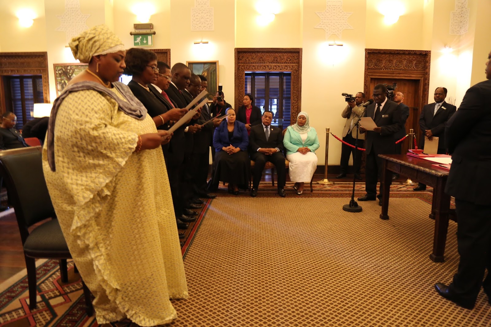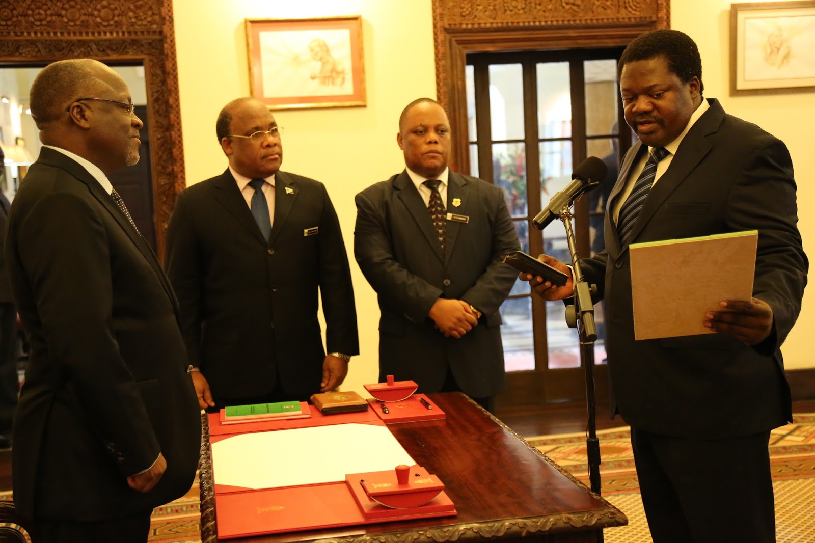Rais wa Jamhuri ya Muungano wa Tanzania Mhe. Dkt. John Pombe Joseph Magufuli akimwapisha Dkt. Emmanuel Nchimbi kuwa Balozi wa Tanzania nchini Brazili, Ikulu jijini Dar esa salaam leo January 20, 2017.